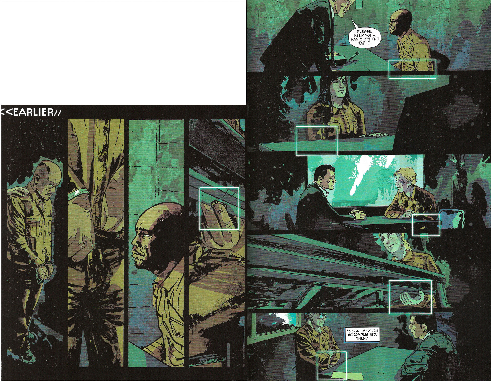 In THE ACTIVITY #5, Nathan Edmondson puts before us a small mystery: Team Omaha is being detained by a torture-happy police force while on mission in Thailand and they’re getting interrogated . (My, that’s a lot of suspicious quotation marks.)